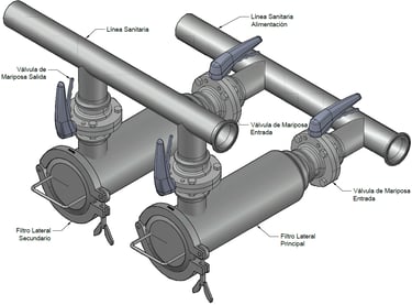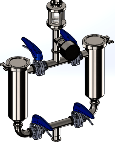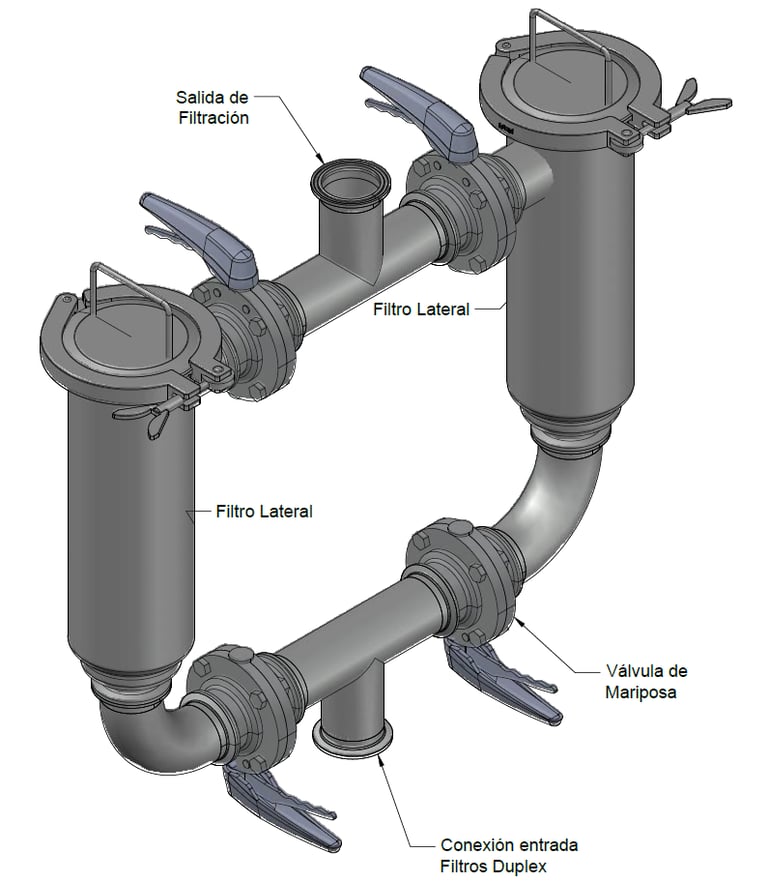 La principal característica de los filtros duplex es contar siempre con un repuesto listo para su uso, el cual entra en funcionamiento al accionar/abrir dos válvulas de mariposa. El segundo filtro en la instalación garantiza el uso continuo del sistema, sin paros en el proceso. Cuando se requiera de mayor capacidad de flujo o de otra manera mayor producto a filtrar, pueden habilitarse ambos filtros.