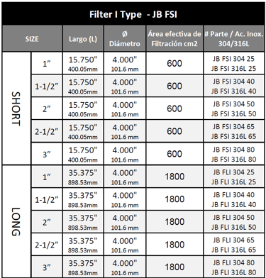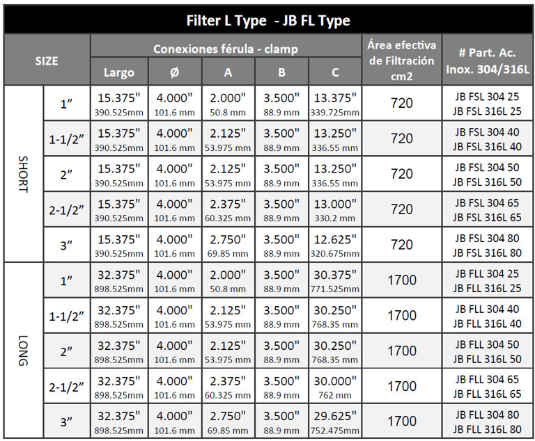 Filtros sanitarios construidos en acero inoxidable 316L para alta resistencia a la corrosión, disponibles dos longitudes. Estos equipos son intercambiables con filtros comparables.