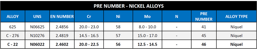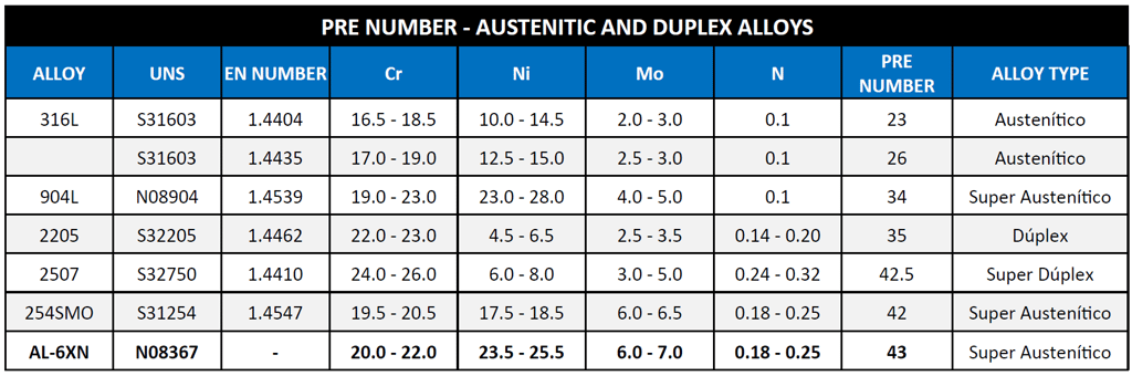 Algunos valores relativos del numero PRE para aceros inoxidables y aleaciones de níquel se muestran en la siguiente tabla. Entre mayor sea el numero mayor es la resistencia a la corrosión por picaduras en medios clorados.