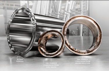 Los principales tipos de corrosión que afectan a las aplicaciones sanitarias y de alta pureza en entornos agresivos de cloruro, son corrosión por picaduras, grietas y corrosión por tensión. Materiales con una alta composición de cromo, níquel, molibdeno y nitrógeno proporcionan una mayor resistencia a estos tipos de corrosión.