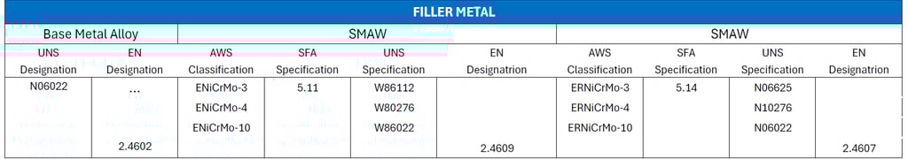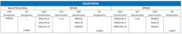 La tabla MM-5.3-1 (Acorde a ASME BPE) enumera los metales de aportación recomendados. para soldar los productos austeníticos, superausteníticos y Aceros inoxidables dúplex y aleaciones de níquel.