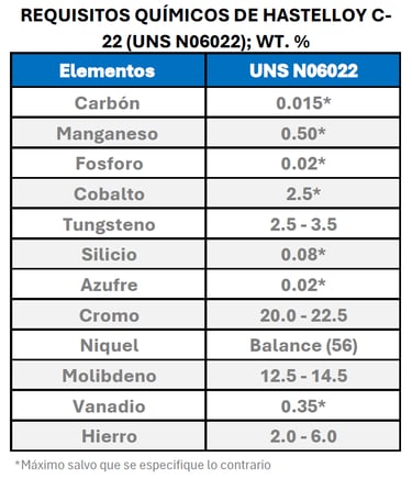 Hastelloy® C-22® (UNS N06022) es la aleación de níquel, cromo, molibdeno y tungsteno más versátil del mercado disponible hoy en día. Esta composición del Hastelloy tiene muchas ventajas que ayudan a mejorar la resistencia a las picaduras, la corrosión por grietas y al agrietamiento por corrosión bajo tensión. Tiene excelente resistencia a los medios acuosos oxidantes, incluido el cloro húmedo, mezclas que contienen acido nítrico y ácidos oxidantes con iones de cloro.