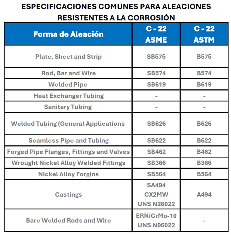 Las aleaciones resistentes a la corrosión están disponibles en las formas de productos más comunes: placa, lámina, bobina/fleje, barra, palanquilla/barra maciza, alambre, tubo y tubing. La Tabla 3 muestra las especificaciones ASME y ASTM aplicables para Allegheny Technologies Incorporated (ATI) AL-6XN® y Haynes Hastelloy® C-22® asociado con las diversas formas de productos de aleación.