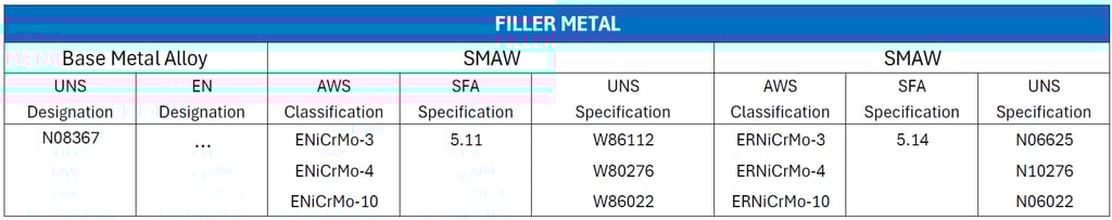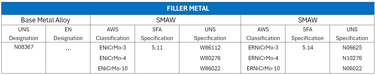La tabla MM-5.3-1 (Acorde a ASME BPE) enumera los metales de aportación recomendados. para soldar los productos austeníticos, superausteníticos y Aceros inoxidables dúplex y aleaciones de níquel.