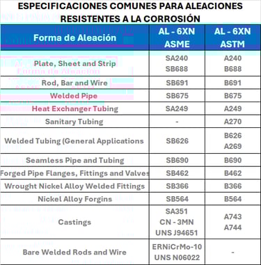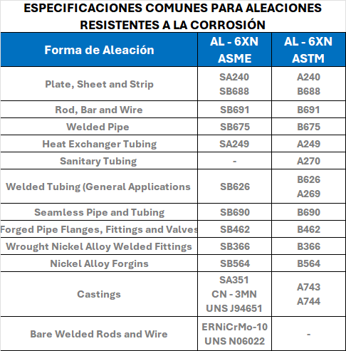 Las aleaciones resistentes a la corrosión están disponibles en las formas de productos más comunes: placa, lámina, bobina/fleje, barra, palanquilla/barra maciza, alambre, tubo y tubing. La Tabla 3 muestra las especificaciones ASME y ASTM aplicables para Allegheny Technologies Incorporated (ATI) AL-6XN®