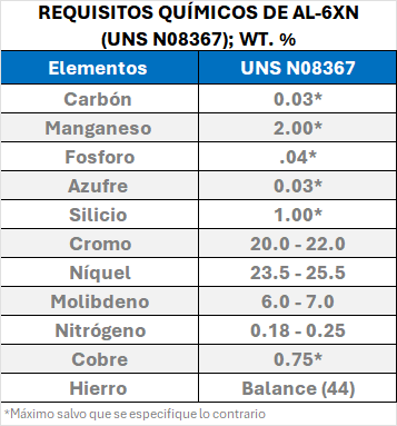 AL-6XN® (UNS N08367) es una aleación superaustenítica de 6 molibdenos que contiene niveles más altos de cromo, níquel molibdeno y nitrógeno que el acero inoxidable 316L. Los elementos de aleación proporcionan más resistencia a la corrosión a soluciones ácidas de cloruro oxidante, haciendo que el AL-6XN a la corrosión por picaduras y grietas y al agrietamiento por corrosión bajo tensión. El AL-6XN supera al 316L y es una alternativa rentable a las aleaciones de níquel más caras en aplicaciones en las que son esenciales una excelente conformabilidad, soldabilidad resistencia a la corrosión son esenciales.