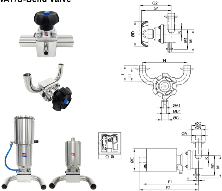 Válvulas de diafragma del grupo CSE - El cuerpo estándar de la válvula de diafragma de dos vías neumática/manual está hecho de acero inoxidable 316L forjado o fundido, esta cumple con los requisitos de superficie en contacto con producto del ASME BPE. Los equipos cuentan con una superficie uniforme para mantener la pureza del fluido. El diseño de ángulo α del cuerpo de la válvula permite que el liquido de limpieza se drene completamente sin causar estancamiento para mantener una cavidad estéril.