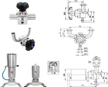 La válvula de diafragma de tres vías se fabrica desde bloque, material forjado o maquinado de precisión en acero inoxidable 316L, la conexión a proceso puede ser soldada AWF o clamp y con accionamiento manual o con actuador neumático. La superficie en contacto con producto se ofrece con pulido mecánico SF1 y electropulido SF4, acorde a ASME BPE.